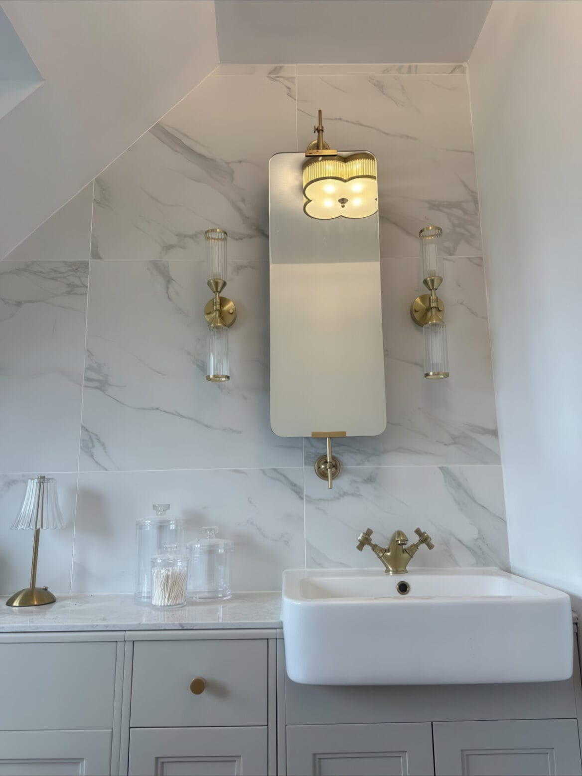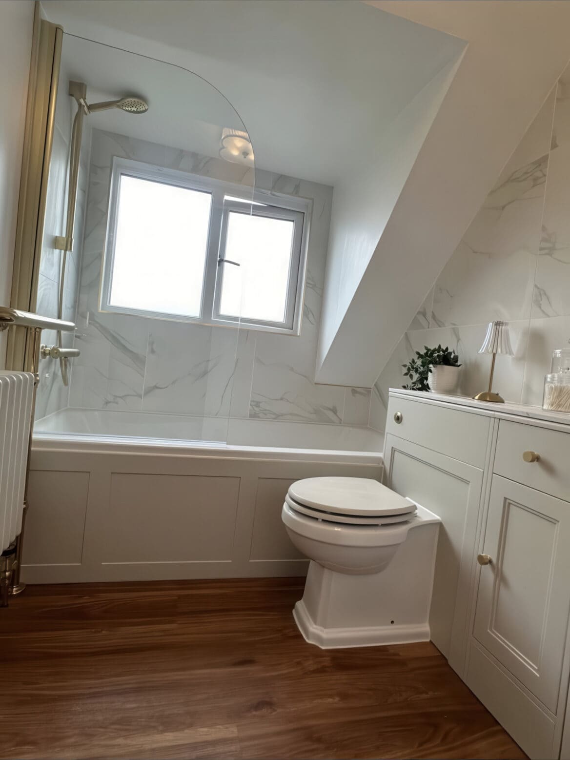 This elegant bathroom transformation showcases a masterful blend of classic design and contemporary comfort. Stunning marble-effect wall tiling creates a luxurious backdrop, with soft grey veining adding depth and sophistication throughout the space.