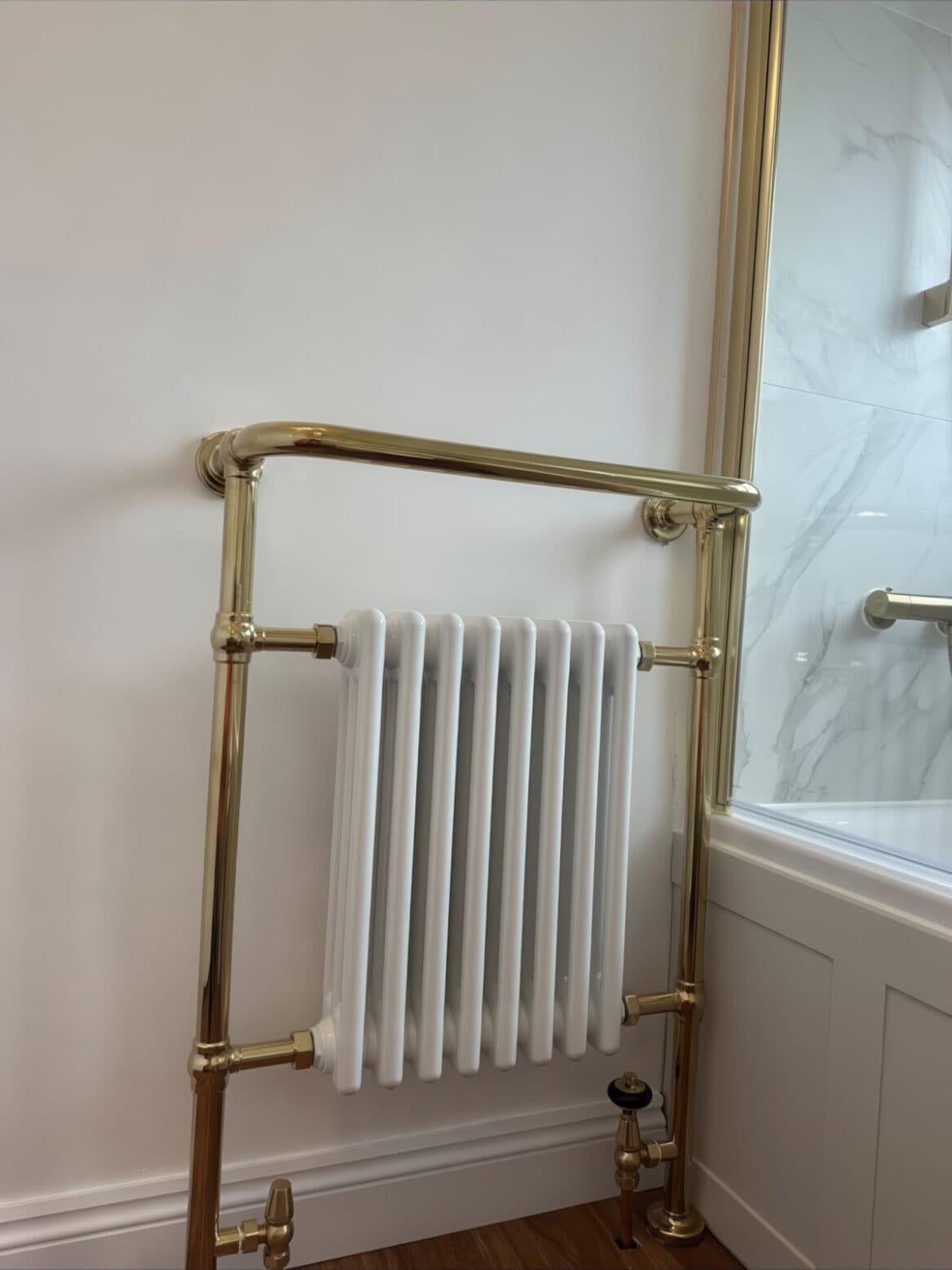 A statement heated towel rail in brushed brass serves as both a practical necessity and design feature—a bathroom where quality craftsmanship meets everyday luxury.